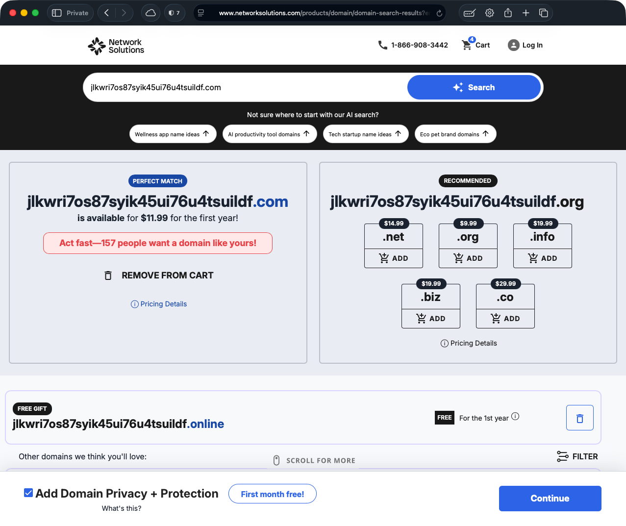 Network Solutions does not show you the full cost up front. You only see it after the domain is added to your cart — which happens automatically when you search.